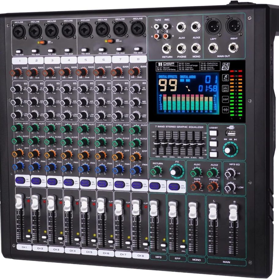 16 entrades (8 xlr) L/R,1 Aux, 1 Monitor, 2 cue. Dimensions:69 x 39,5 x 16,5 cm. Pes: 12 kg